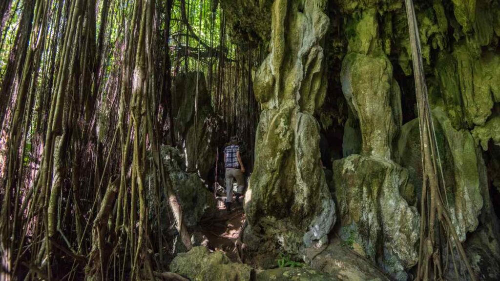 This vast, cathedral-like cave is filled with stalactites, stalagmites, towering chambers, and banyan roots that spill down from the jungle above. Deep inside, there’s even a freshwater cave pool, where you can swim by candlelight – an unforgettable experience.