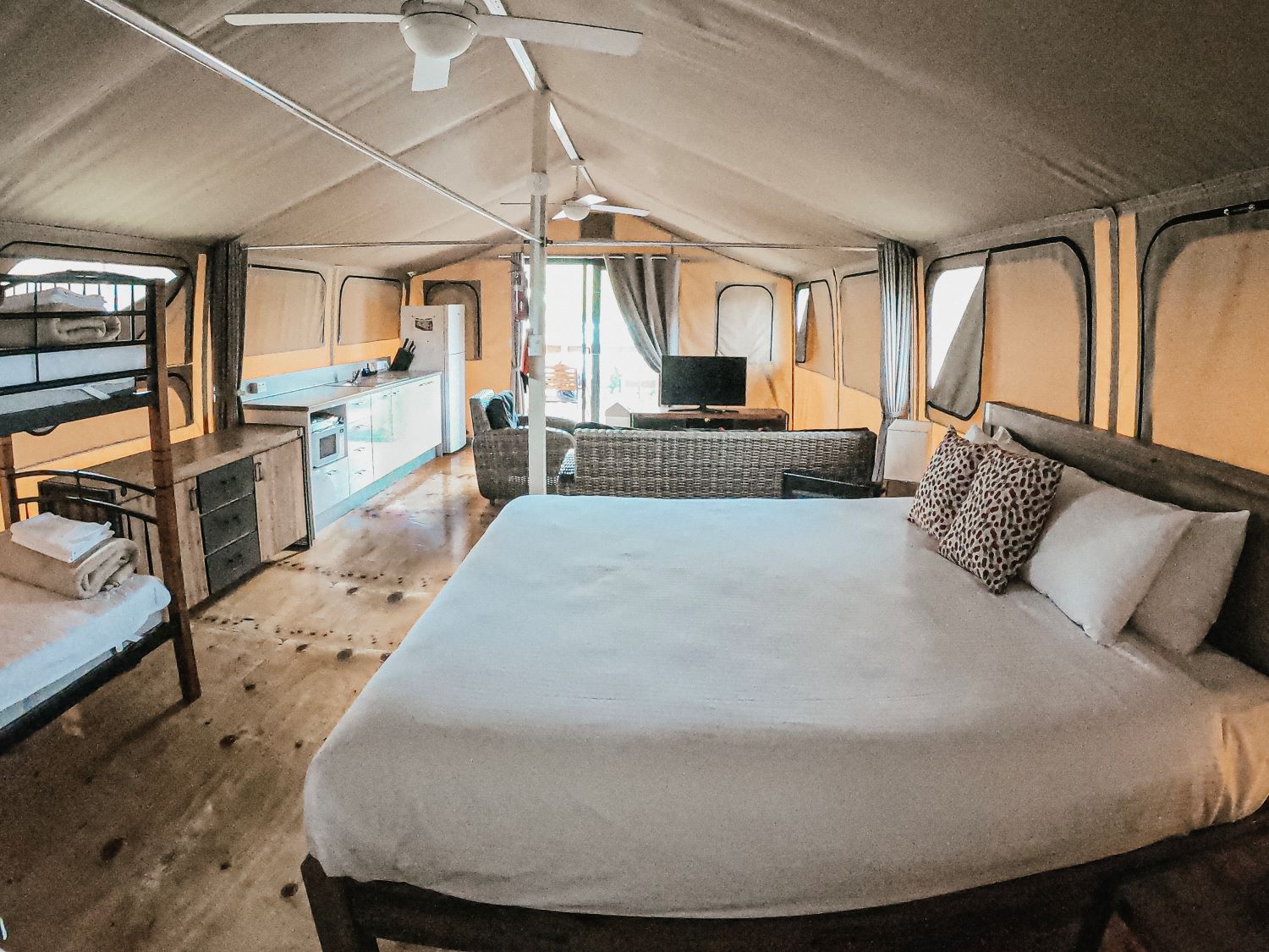 Fraser St Discovery Parks have designed these great glamping tents with families in mind. Each tent comes with the comfort of a queen bed, bunks, living room, kitchenette, en-suite and a deck with BBQ facilities. All of this overlooks your own private piece of lake!